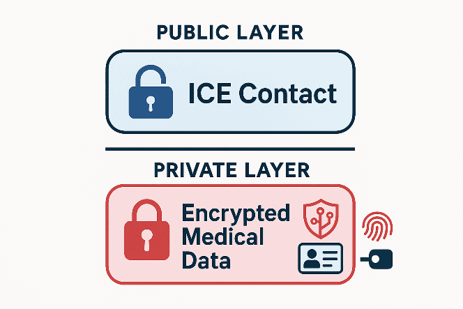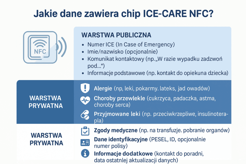 • warstwa publiczna – podstawowe informacje ICE (kontakt, ostrzeżenia),