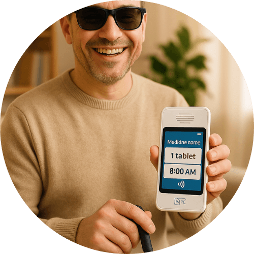 Medi Care NFC to system wsparcia farmakoterapii zaprojektowany dla pacjentów, którzy mają trudności z samodzielnym rozpoznawaniem leków i prawidłowym stosowaniem dawkowania – w szczególności osób niewidomych, słabowidzących, seniorów oraz pacjentów przewlekle chorych.